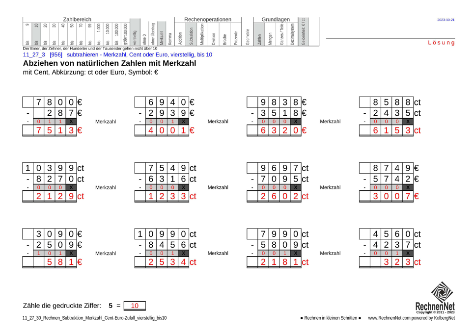 Subtraktion von natürlichen vierstelligen Zahlen mit Merkzahl und ct oder € bis 10