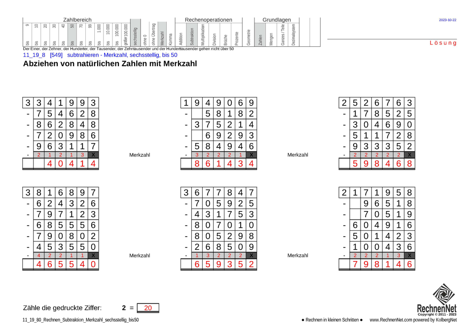 Hier werden bis zu sechs Ziffern voneinander abgezogen bis 50